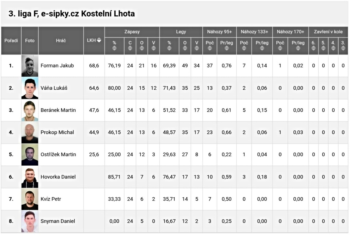 V pátek 31.10. se naši šipkaři utkali doma s družstvem Arachnids Poříčany, se kterým uhráli remízu 9:9 (předehrané utkání). Pod novým názvem e-šipky.cz Kostelní Lhota jsme po tomto výsledku na průběžném pátém místě ve 3. lize skupiny F v rámci Středočeského kraje.