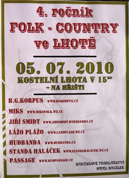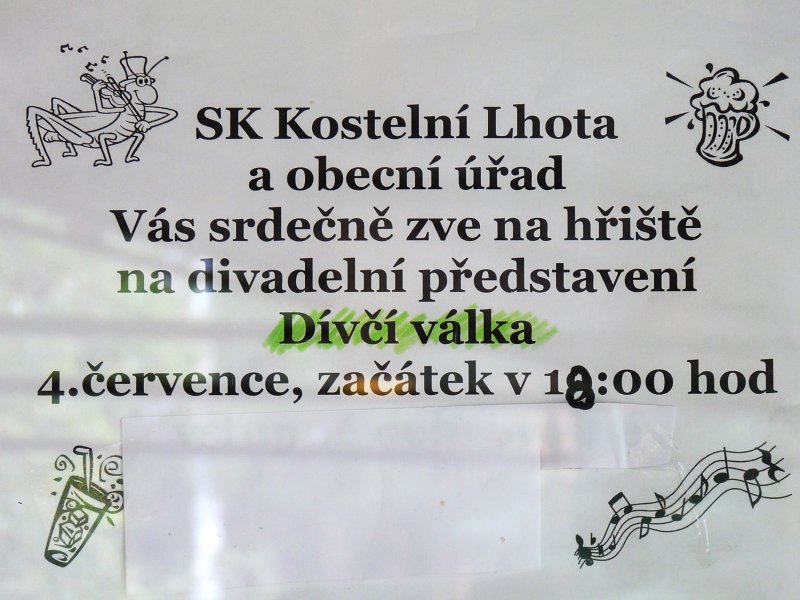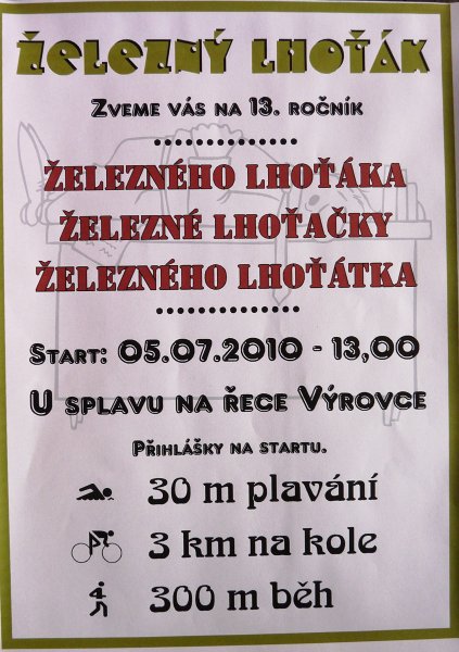 Dívčí válka je divadelní představení Fr.Ringo Čecha, které se odehraje v neděli 4.7. od 18,00 hodin na hřišti.13. Železný Lhoťák má start v pondělí 5.7. ve 13,00 hodin u splavu na Výrovce. Přihlášky na startu. 4. ročník Folk a Country skupin se koná ve stejný den 5.7. od 15,00 hodin na hřišti za účasti sedmi kapel. Vystoupí i náš folkař Standa Haláček. Odkazy: pozvánky na Divadlo, Železňáka, Folk&Country, fotky ze stavby pódia, fotky z r.2008, rok 2009- video#1, video#2. | ||